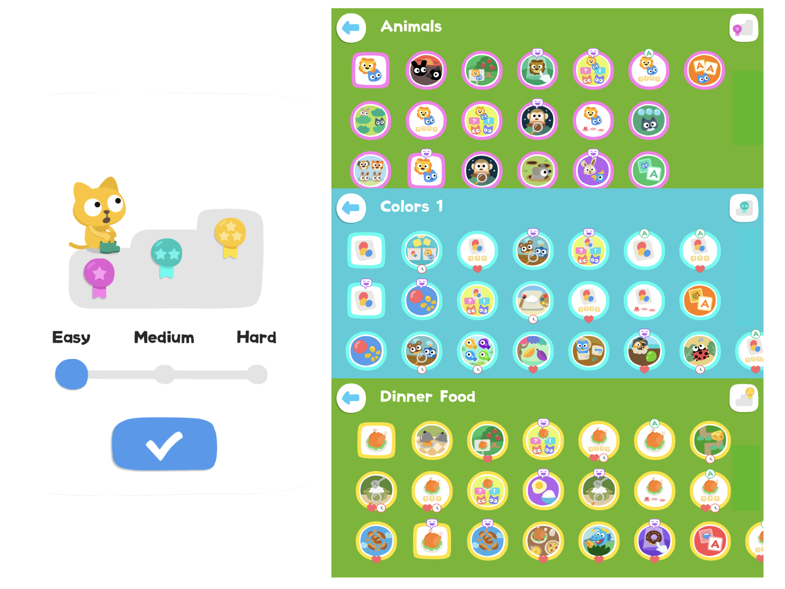 Dette området lar barnet ditt fokusere på spesifikke ordforrådsett som dyr, farger, mat og mye mer, med en tydelig innstilling for å bytte mellom lett, middels eller vanskelig nivå.